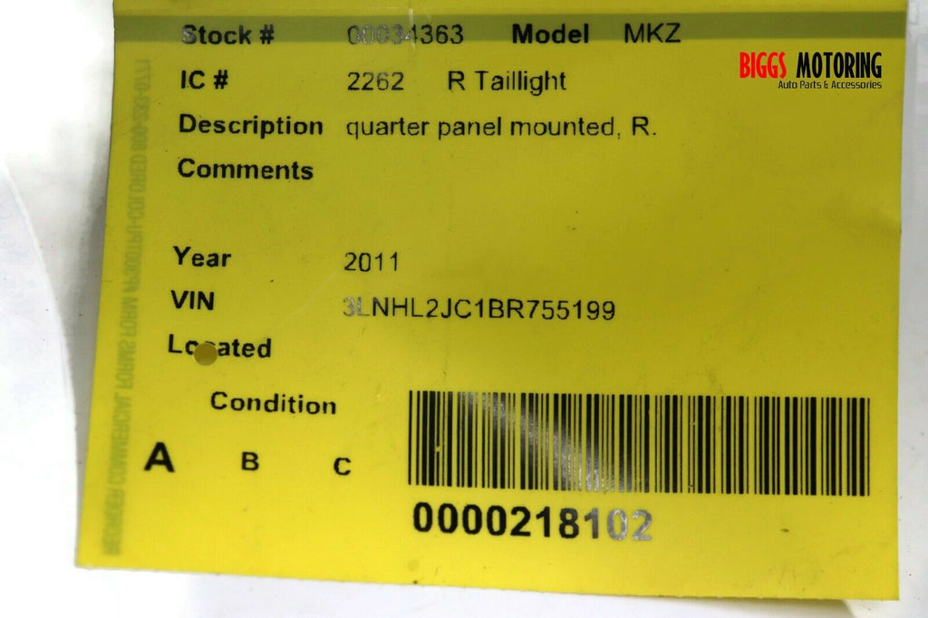 2010-2012 Lincoln MKZ Passenger Right Side Rear Tail Light 34363