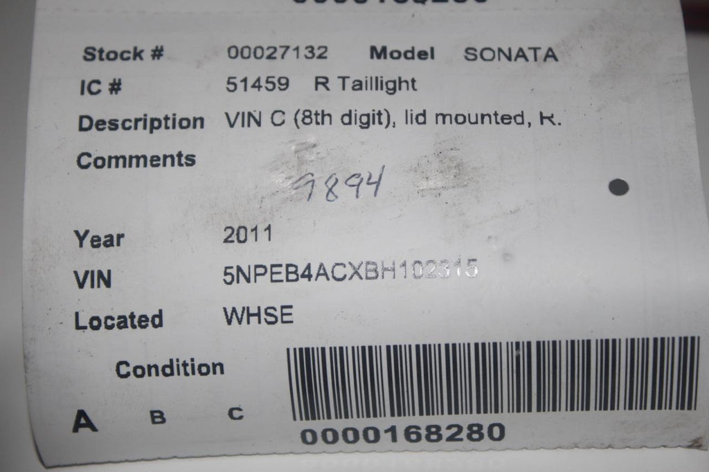 2011-2014 HYUNDAI SONATA PASSENGER SIDE TRUNK LID TAIL LIGHT 27132 RE# biggs
