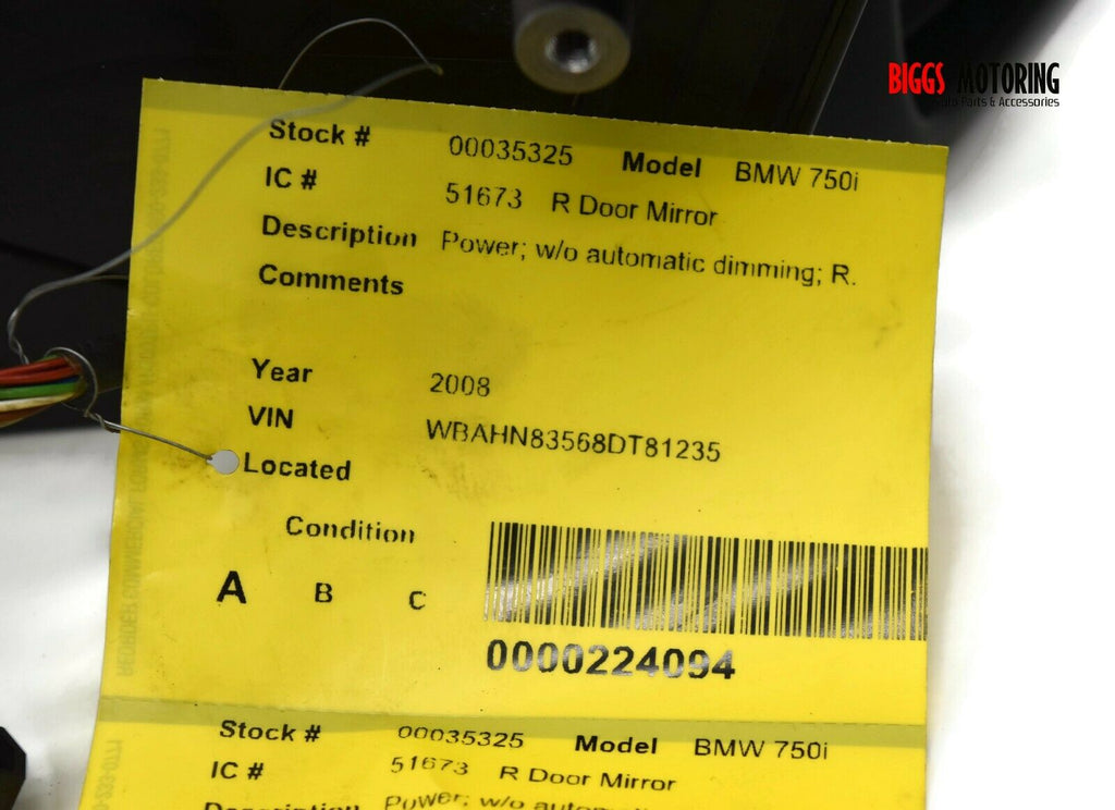 2002-2008 BMW 750i Passenger Right Side Power Door Mirror Black 35325