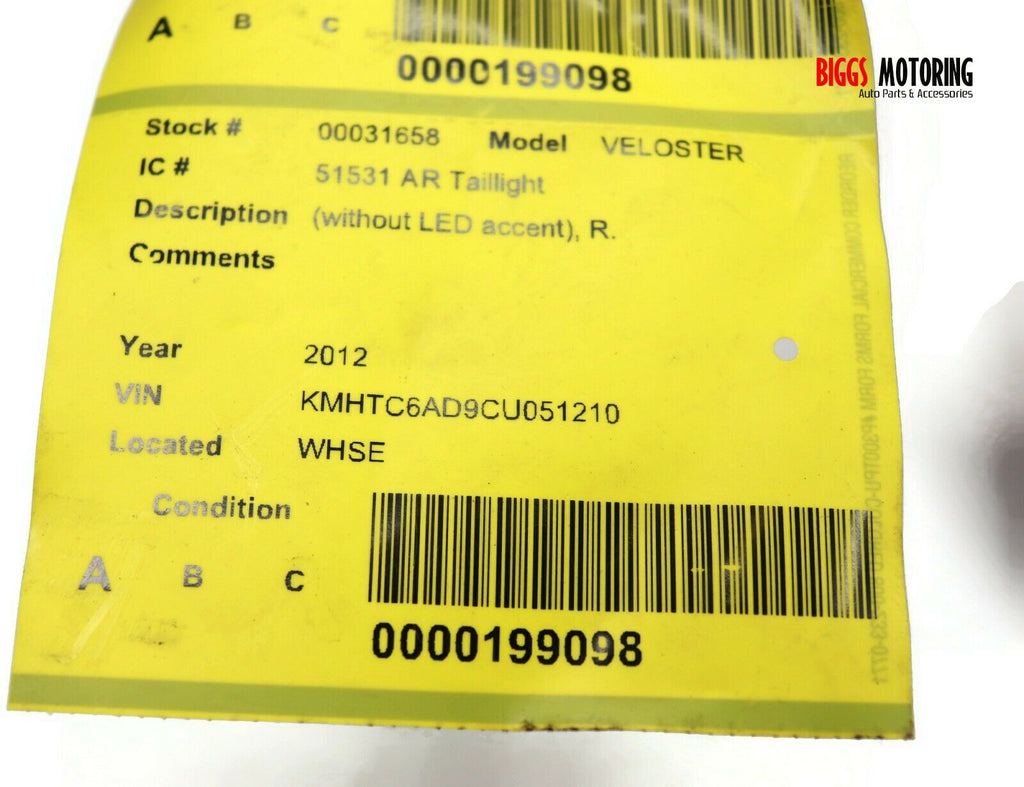 2012-2016 Hyundai Veloster Passenger Right Side Rear Tail Light 31658