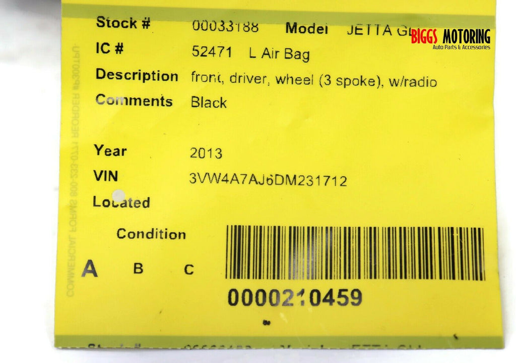 Volkswagen Jetta Driver Side Steering Wheel Air Bag Black 33188